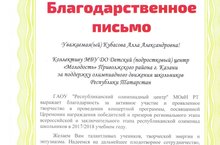 Коллективу МБУДО Детский (подростковый) центр "Молодость" и директору Кубасовой А.А. выразили благодарность за активное участие и проявленное творчество в проведении концертной программы, посвященной Церемонии награждения победителей и призеров регионального этапа всероссийской и заключительного этапа республиканской олимпиад школьников в 2017-2018 учебном году.