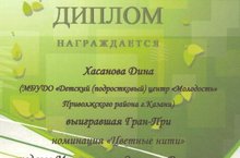 Поздравляем наших воспитанниц Хасанову Дину (Гран-При в номинации "Цветные нити"), Панову Арину (1место в номинации "Лепка") и Балыкову Ксению (2место в номинации "Рисунок") и их педагогов Ирину Валентиновну Адигамову, Эльмиру Рамилевну Миннегалиеву и Ксению Игоревну Прошину с победами и желаем дальнейших успехов!
