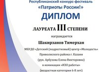 По итогам Республиканского конкурс-фестиваля "Патриоты России" воспитанник ДПЦ "Молодость" объединения "Юный дизайнер" (педагог - Арбузова Елена Викторовна) занял призовое место: