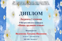 Поздравляем с победой педагога-организатора нашего центра Виденееву Татьяну Ивановну. На II Всероссийском конкурсе "Наша дружная семья" работа педагога заняла 1 место.