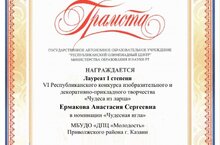 По итогам VI Республиканского конкурса изобразительного и декоративно-прикладного творчества "Чудеса из ларца" педагог дополнительного образования Ермакова Анастасия Сергеевна стала Лауреатом I степени в номинации "Чудесная игла". Поздравляем!!!