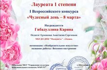 По итогам I Всероссийского конкурса "Чудесный день - 8 марта" учащиеся объединения "Палитра идей" (педагог - Ермакова А.С.) заняли призовые места: