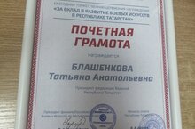 Наш педагог дополнительного образования Блашенкова Татьяна Анатольевна является Президентом федерации Вадокай РТ, была награждена почётной грамотой за вклад в развитие боевых искусств в Республике Татарстан.