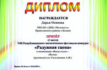 По итогам VIII Республиканского экологического фестиваль-конкурса "Радужная сцена" в номинации "Вокал-соло" - "Весна" учащаяся объединения "Вокальный ансамбль "ДоРеMix"" (педагог - Гильманова А.Ф.) Осипова Дарья заняла 3 место. Поздравляем и желаем дальнейших творческих успехов.