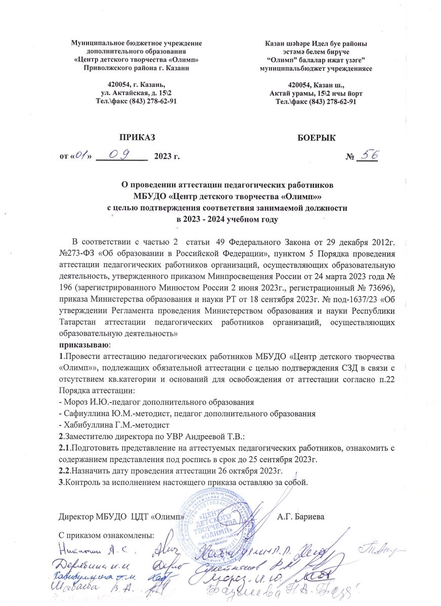 Приказ об утверждении состава аттестационной комиссии МБУДО ЦДТ "Олимп", 2023г.