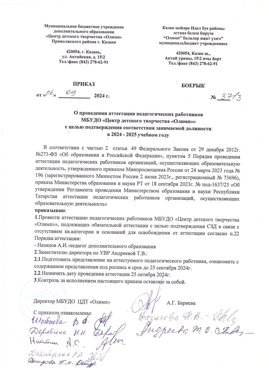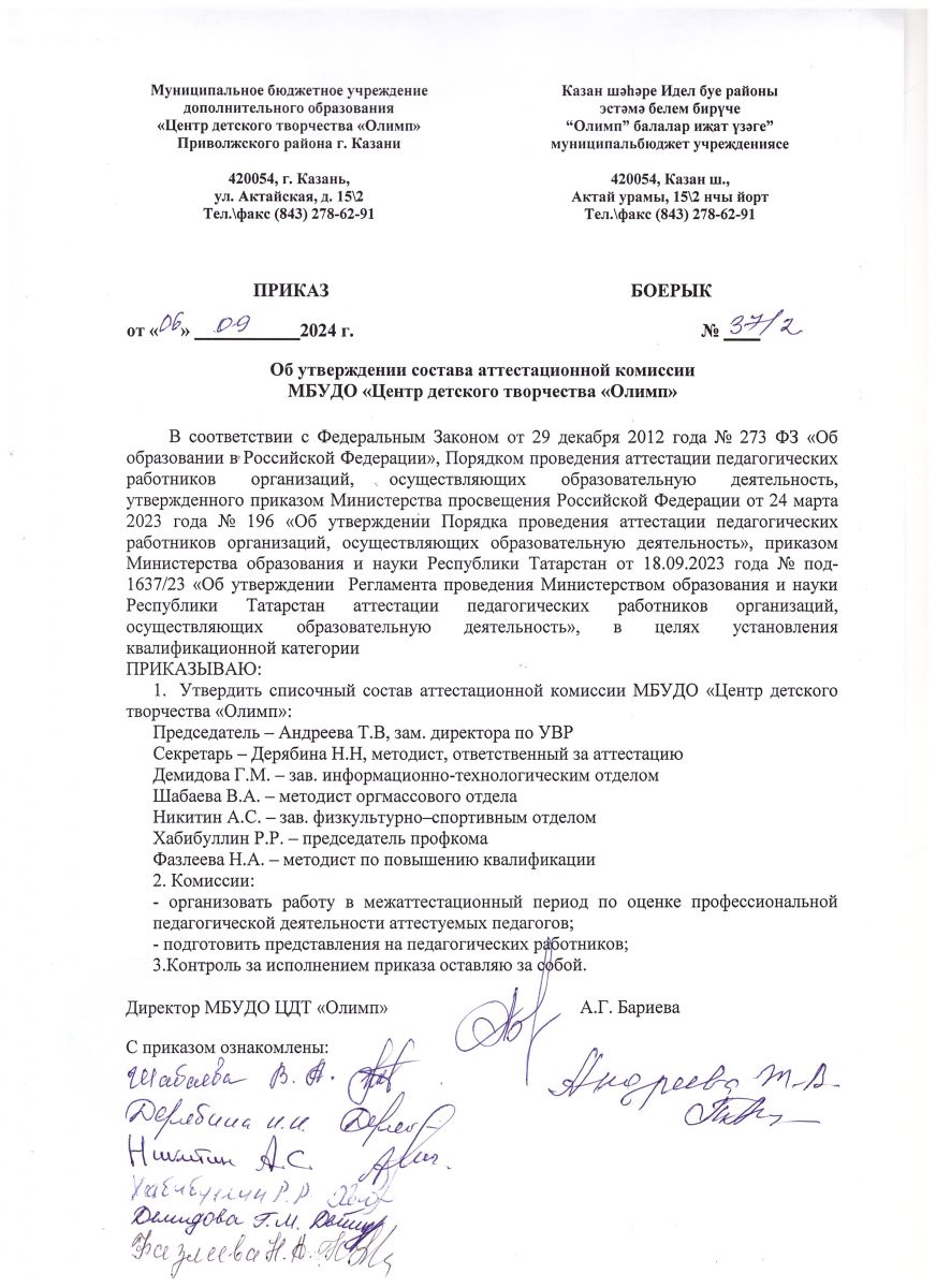 Приказ об утверждении состава аттестационной комиссии МБУДО ЦДТ "Олимп", 2024г.