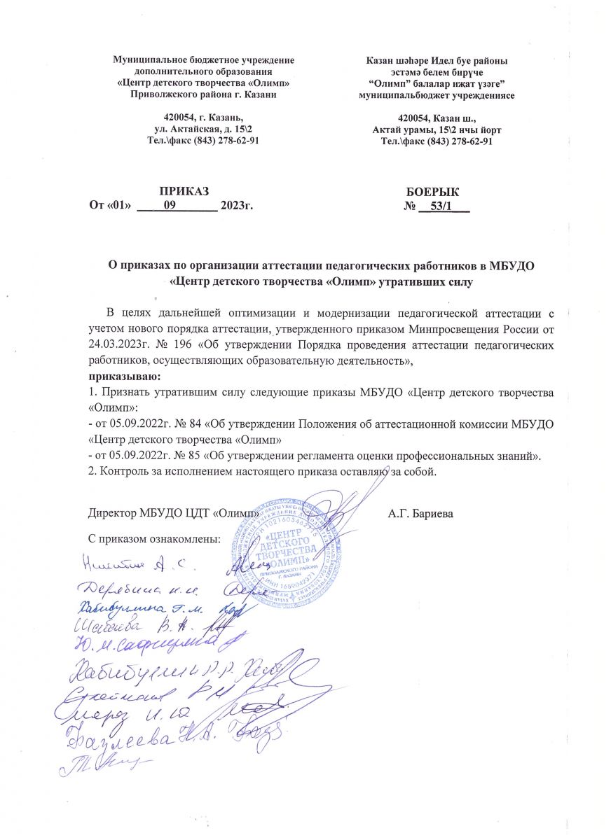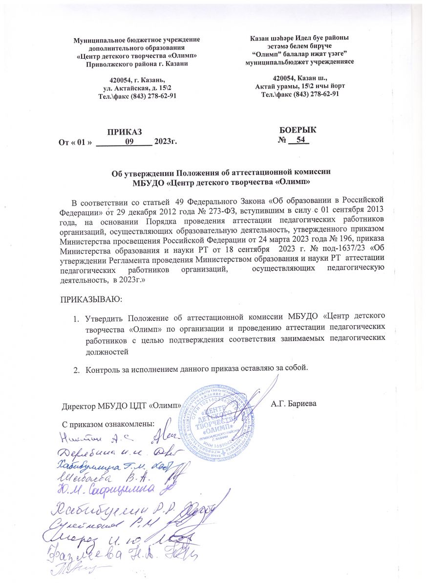 Приказ об утверждении Положения об аттестационной комиссии МБУДО ЦДТ "Олимп", 2023-2024 учебный год