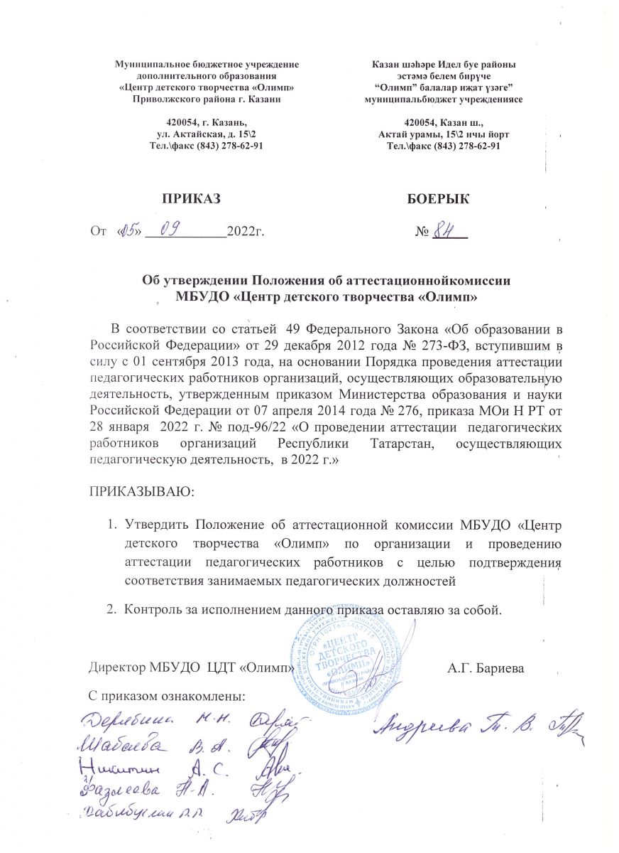 Приказ об утверждении Положения об аттестационной комиссии МБУДО ЦДТ "Олимп", 2021-2022 учебный год