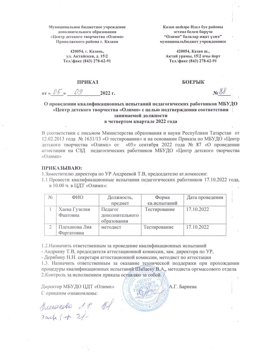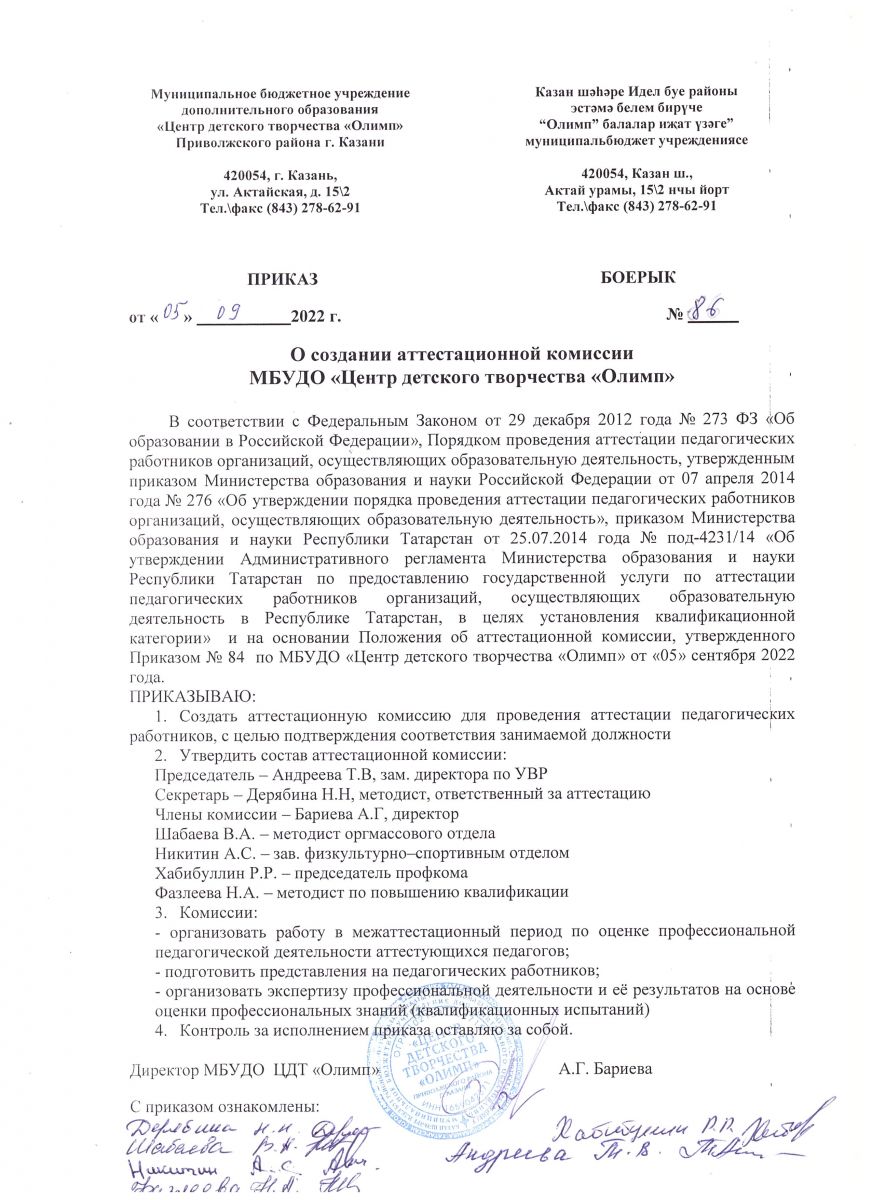 Приказ о создании аттестационной комиссии МБУДО ЦДТ "Олимп" 2022г.
