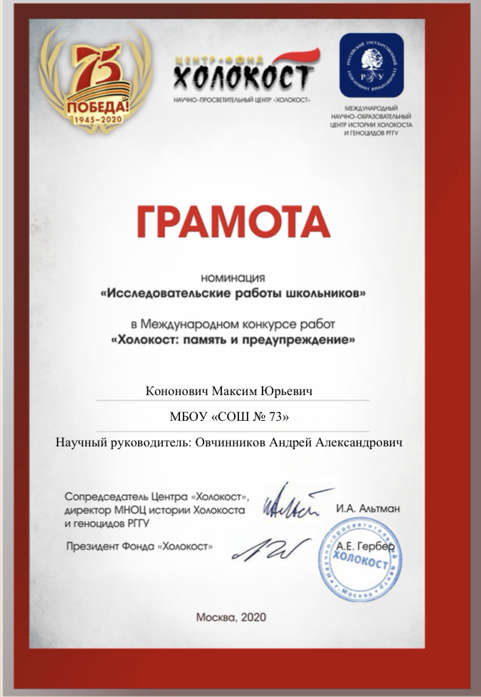В этом году Максим Кононович, ученик 8 "А" класса принял участие в Международном конкурсе работ "Холокост:память и предупреждение" в номинации "Исследовательские работы школьников", научным руководителем выступил учитель истории и обществознания Андрей Александрович Овчинников.