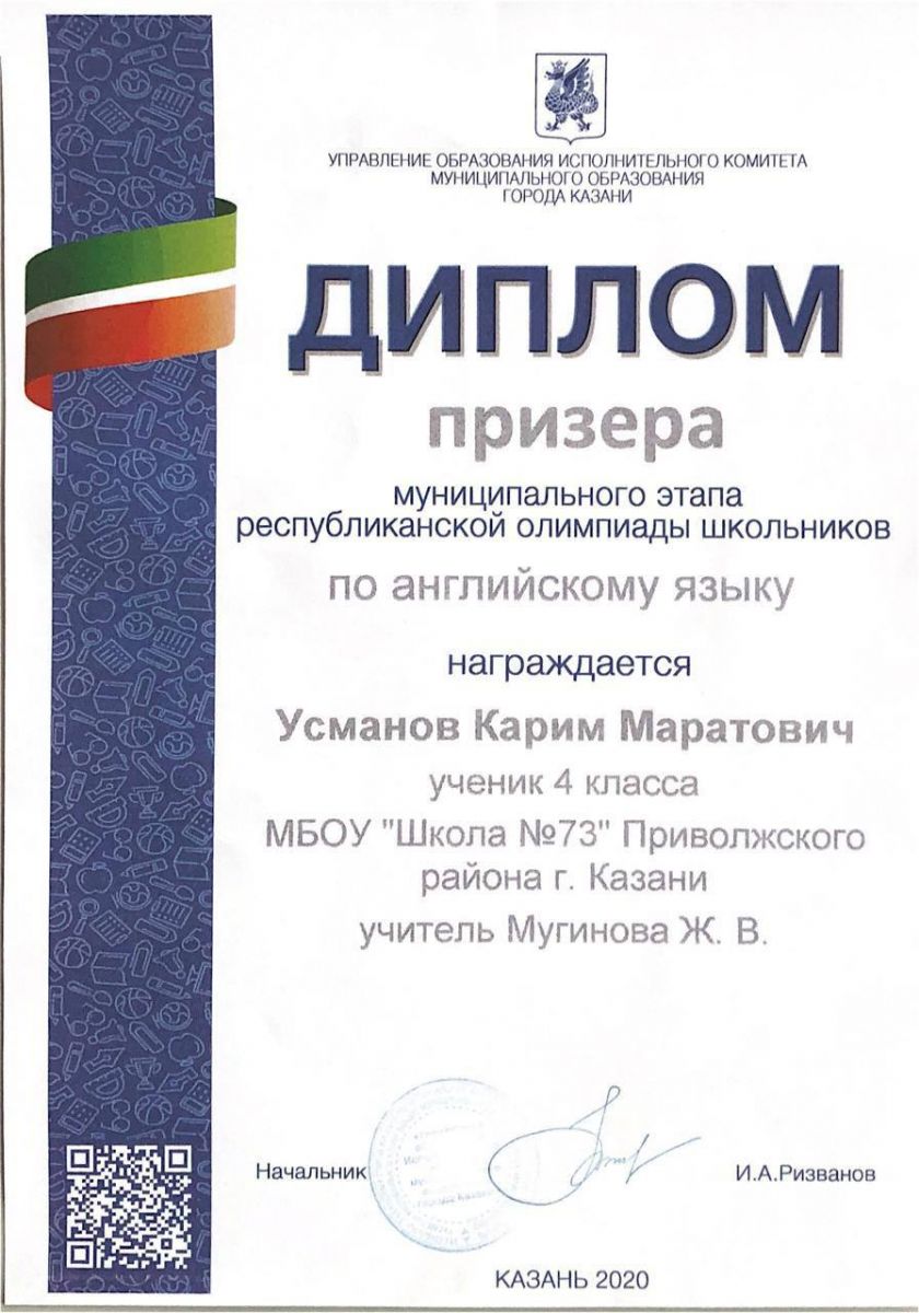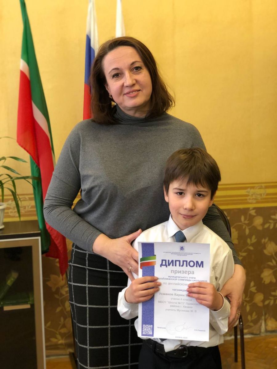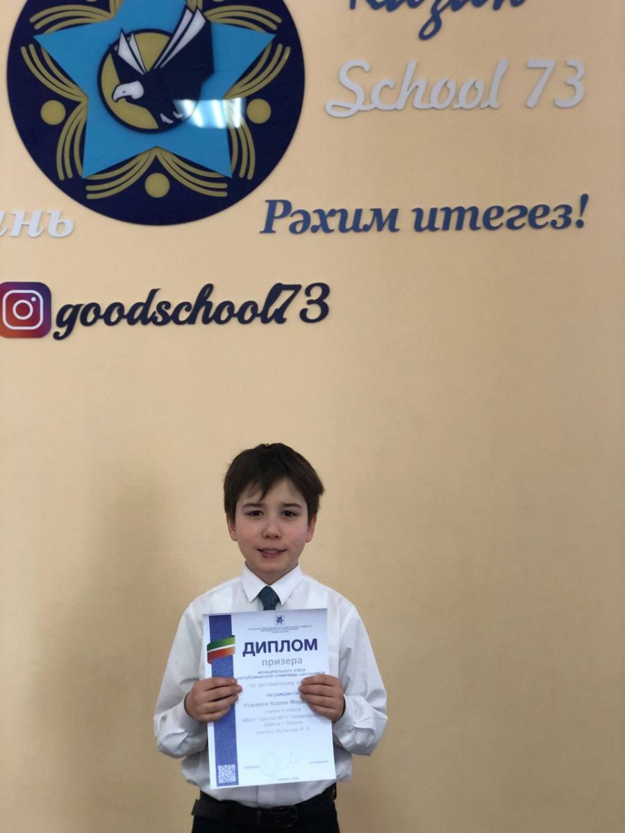 Опубликовано: 11.02.2021Призёр муниципального этапа в республиканской олимпиаде по английскому языку Усманов Карима, ученик 4а класса, поздравляем тебя и гордимся тобой. Выражаем благодарность учителюанглийского языка Мугиновой Жанне Владимировне за подготовку призёра!