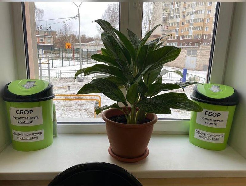 На первом этаже школы установлена ёмкость, куда дети и взрослые могут складывать использованные батарейки.