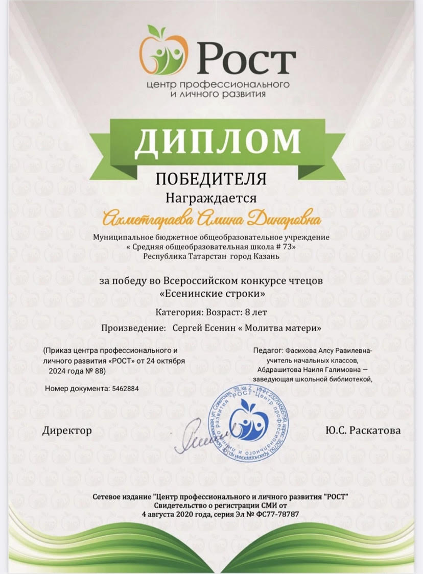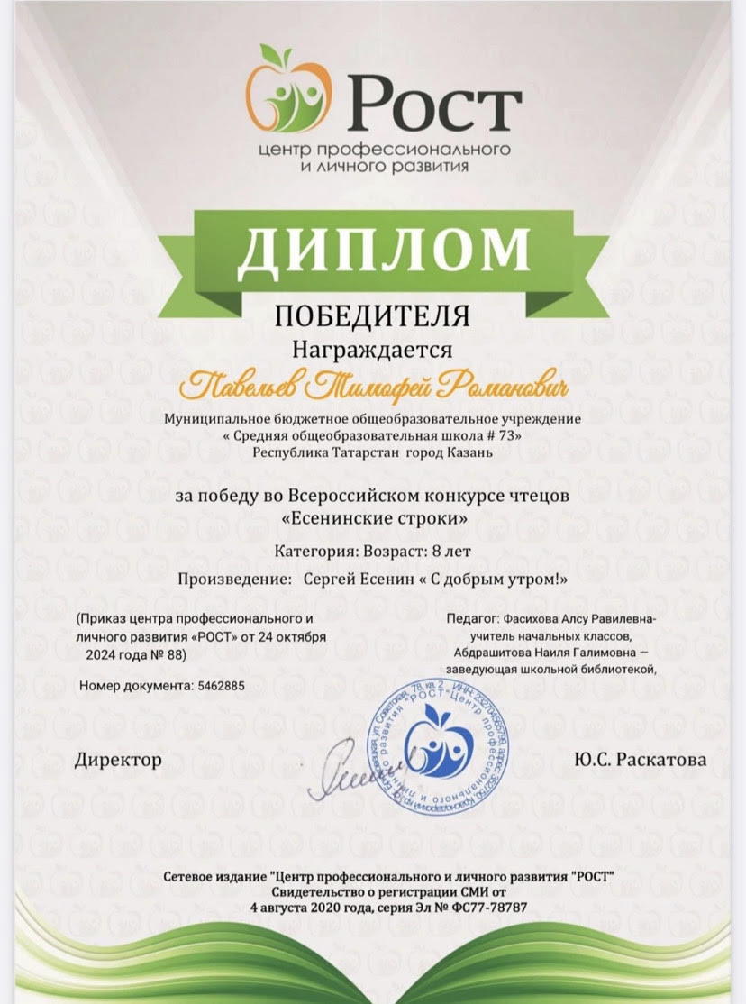 Опубликовано: 25.11.2024Поздравляем наших талантливых учеников с яркими победами на Всероссийском конкурсе чтецов «Есенинские строки»! Мы гордимся тем, что наши ребята смогли продемонстрировать свои навыки и любовь к поэзии Сергея Есенина. Их труд принес заслуженные результаты!