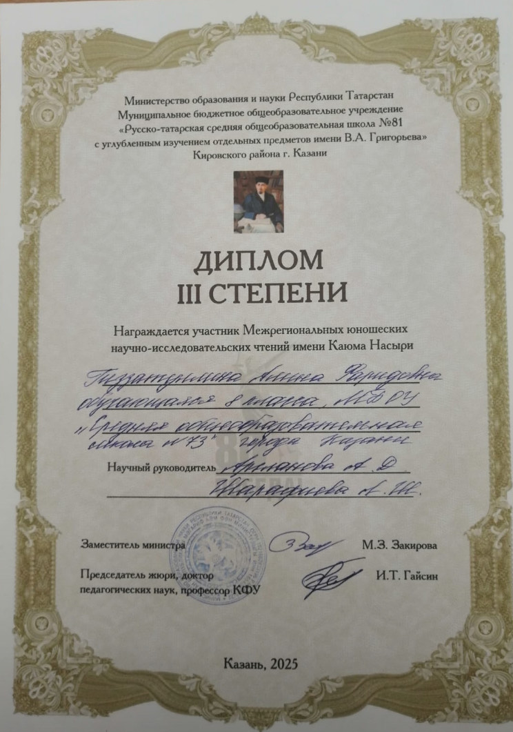 Опубликовано: 28.03.2025Поздравляем нашу талантливую ученицу! С радостью сообщаем, что 28 марта наша ученица 8Л класса, Гиззатуллина Алина, приняла участие в Межрегиональных юношеских научно-исследовательских чтениях имени Каюма Насыри. Ее работа была высоко оценена жюри, и Алина заслуженно получила диплом III степени!