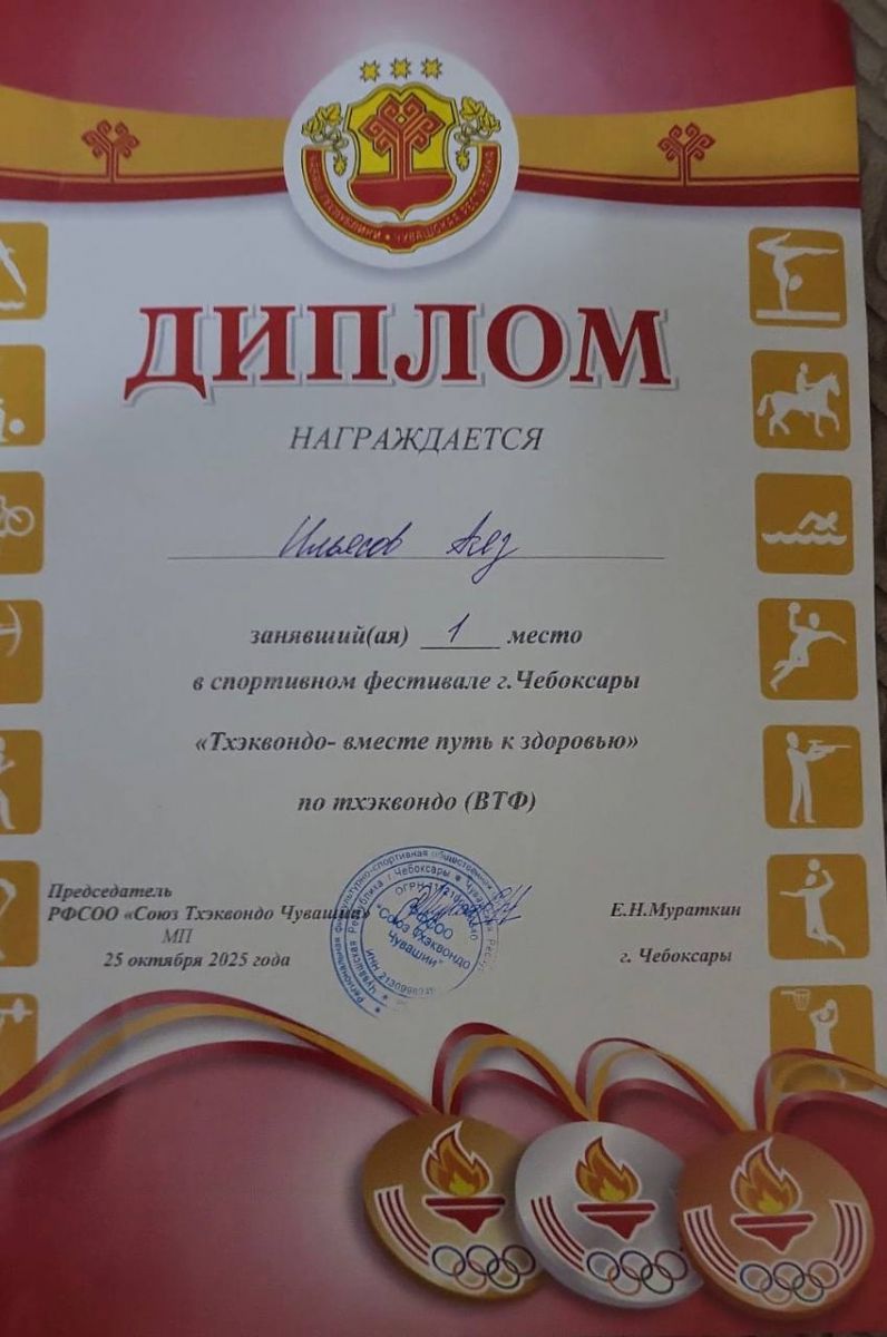 Опубликовано: 29.10.202524-25 октября в Чебоксарах проходили соревнования по тхэквондо «Первенство г. Чебоксары», где наш талантливый спортсмен продемонстрировал отличные навыки и завоевал 1 место!