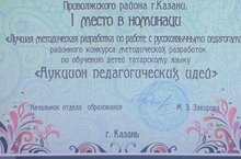 Наши педагоги получили Диплом 1 место в районном конкурсе "Аукцион педагогических идей" в номинации "Лучшая методическая разработка по работе с русскоязычными педагогами"