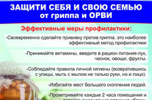 Как защититься от ОРВИ и гриппа. Памятка для населения.Острые респираторные вирусные инфекции (ОРВИ) являются самыми распространенными среди инфекционных заболеваний и наиболее актуальными в зимний период. ОРВИ вызываются разнообразными респираторными вирусами, которых насчитывается более двухсот видов. Наиболее тяжелым заболеванием является грипп.КАКОВЫ СИМПТОМЫ ГРИППА?Для гриппа характерно внезапное начало с подъема температуры тела до высоких цифр, выраженная интоксикация, озноб, мышечные и головные боли, сухой кашель, слезотечение. Наибольшему риску заболевания гриппом подвергаются маленькие дети, пожилые люди. У больных гриппом часто наблюдаются обострения хронических заболеваний: бронхиальной астмы и хронического бронхита, сердечнососудистых заболеваний, заболеваний почек, нарушение обмена веществ и т.д. Грипп отличается от других инфекций тяжелым течением, наличием осложнений, которые могут закончиться смертельным исходом.КАК ЗАЩИТИТЬСЯ?Очень важна профилактика ОРВИ и гриппа. Безусловно, намного легче предотвратить заболевание, чем заниматься его лечением. Эффективность профилактики гриппа и ОРВИ будет достигнута при комбинации средств специфической и неспецифической защиты.К специфической профилактике относится вакцинация. Вакцинация против гриппа проводится однократно и иммунитет сохраняется в течение года. Прививаться против гриппа лучше до начала эпидемического подъема заболеваемости гриппом, так как иммунитет формируется две недели.К неспецифической профилактике относятся мероприятия, направленные на общее укрепление организма.