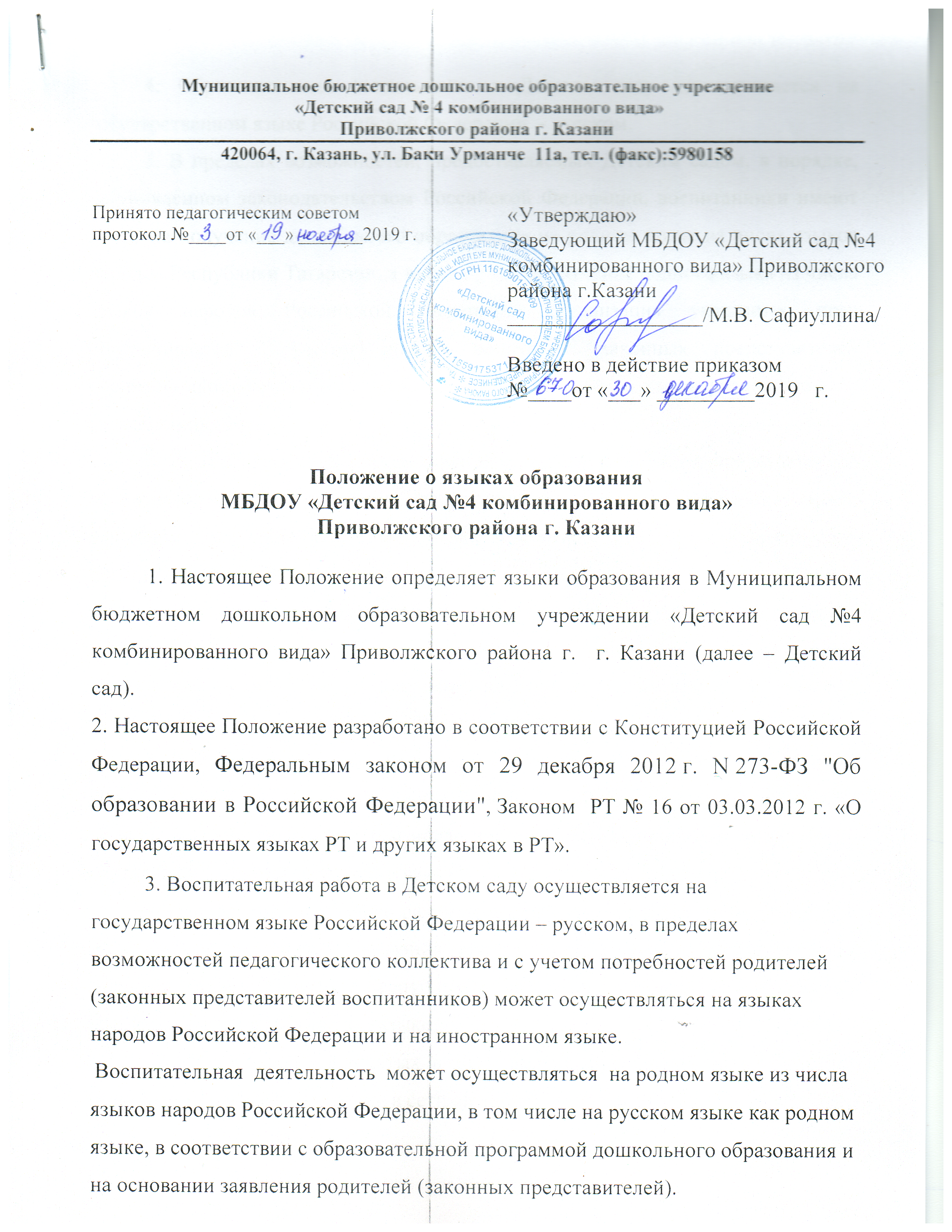 Муниципальное бюджетное дошкольное образовательное учреждение «Детский сад №4 комбинированного вида» Приволжского района г.Казани