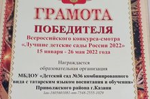 Казан шәһәре башкарма комитеты Идел буе районының МБМБУ “Татар телендә тәрбия һәм белем бирүче катнаш төрдәге 36 нчы балалар бакчасы” Россиянең иң яхшы балалар бакчасы 2022 Бөтенроссия конкурсында җиңү яулады!