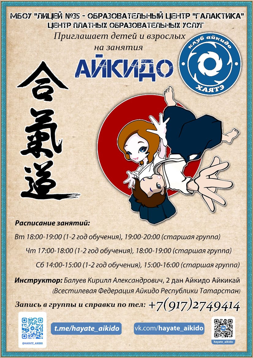 МБОУ "Лицей №35 - Образовательный центр "Галактика" (Центр платных образовательных услуг) и Клуб Айкидо "Хаятэ" приглашают детей и взрослых на занятия Айкидо.