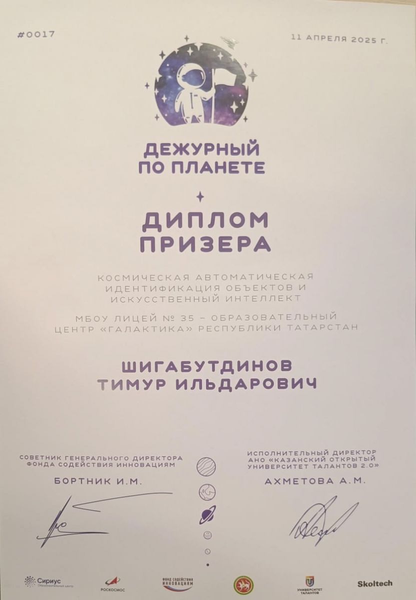 Опубликовано: 15.04.2025Организаторами программы «Дежурный по планете» выступили Фонд содействия инновациям, Госкорпорация «Роскосмос», Фонд «Талант и успех», Сколковский институт науки и технологий при поддержке Министерства образования и науки РТ и Университета Талантов.