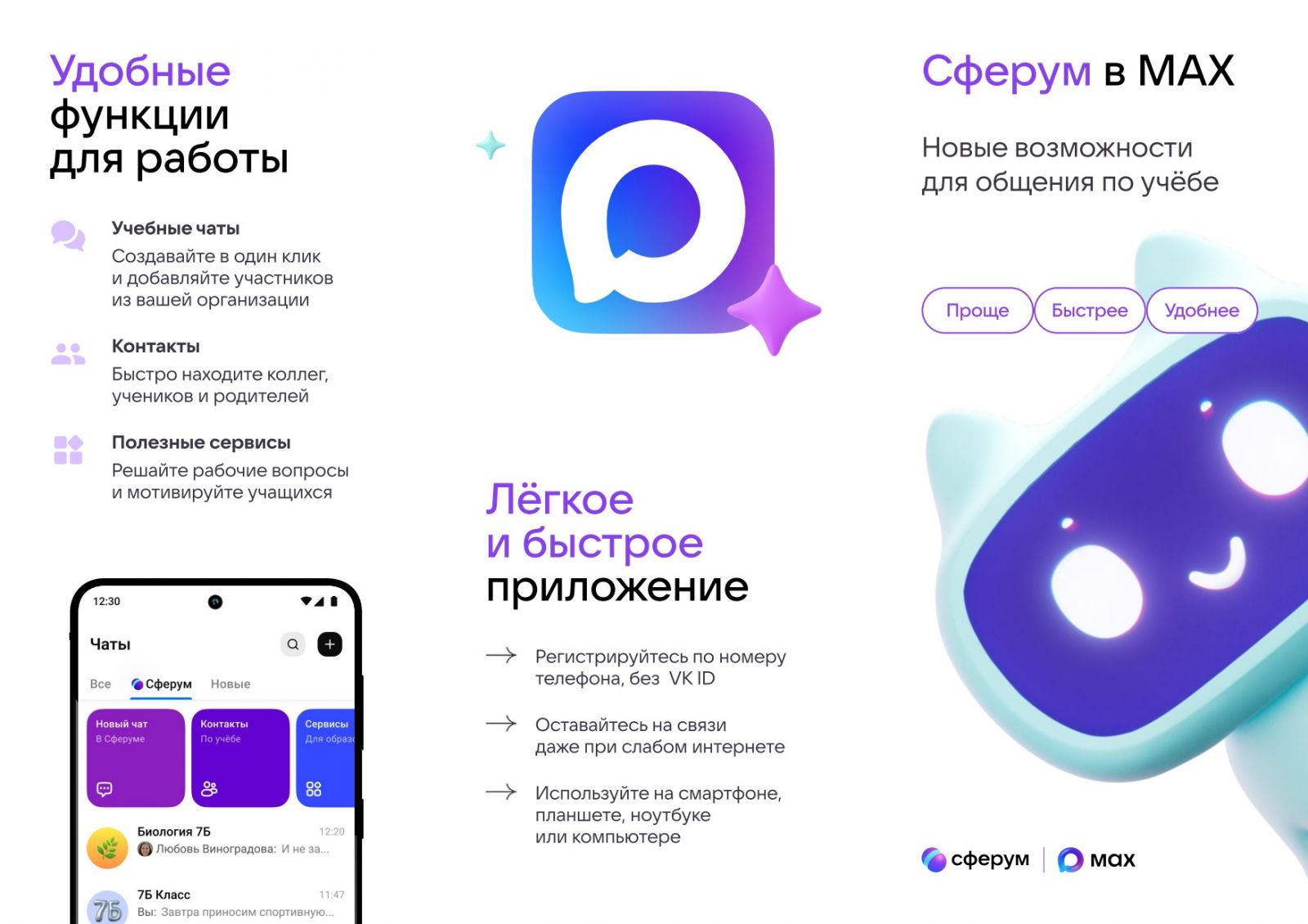 Безопасность и контроль: Мах интегрируется с образовательной платформой «Сферум», что повышает безопасность школьных коммуникаций и упрощает администрирование.