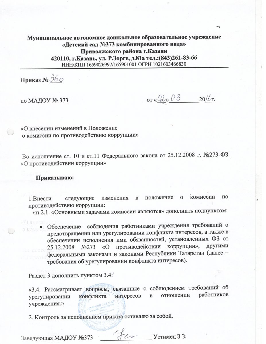 Приказ о внесении изменений в Положение о комиссии по противодействию коррупции