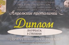 24.03.2017 года состоялся ГАЛА-концерт XII Открытого фольклорного фестиваль-конкурса воспитанников дошкольных образовательных учреждений "Апрельские проталинки". Поздравляем наших победителей с Дипломом Лауреата I степени.