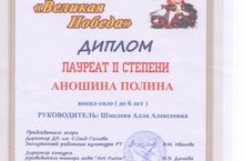 Воспитанница старшей группы АНОШИНА ПОЛИНА приняла участие в городском конкурсе "Великая Победа" в рамках творческого проекта "Жемчужина Татарстана 2015". Полина получила ДИПЛОМ лауреата II степени. ПОЗДРАВЛЯЕМ!!!