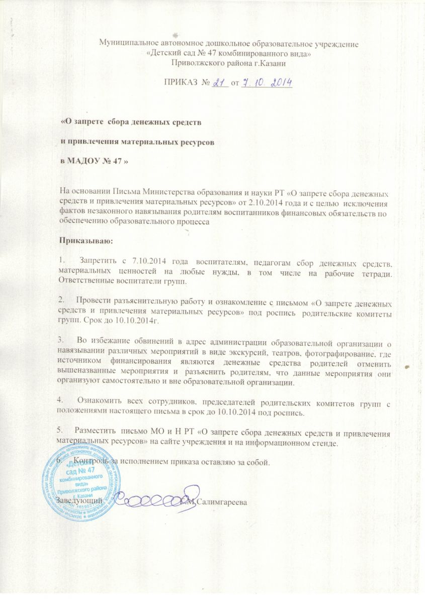 приказ о запрете сбора денежных средств по МАДОУ д/с №47