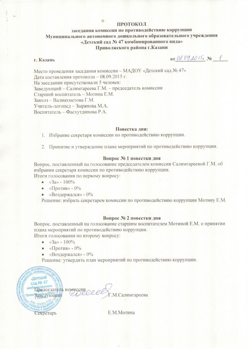 Протокол заседания комиссии по противодействию коррупции № 2 (лист 1)