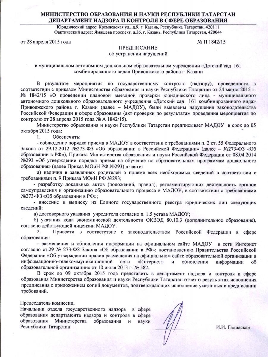 Предписание Департамента надзора и контроля в сфере образования