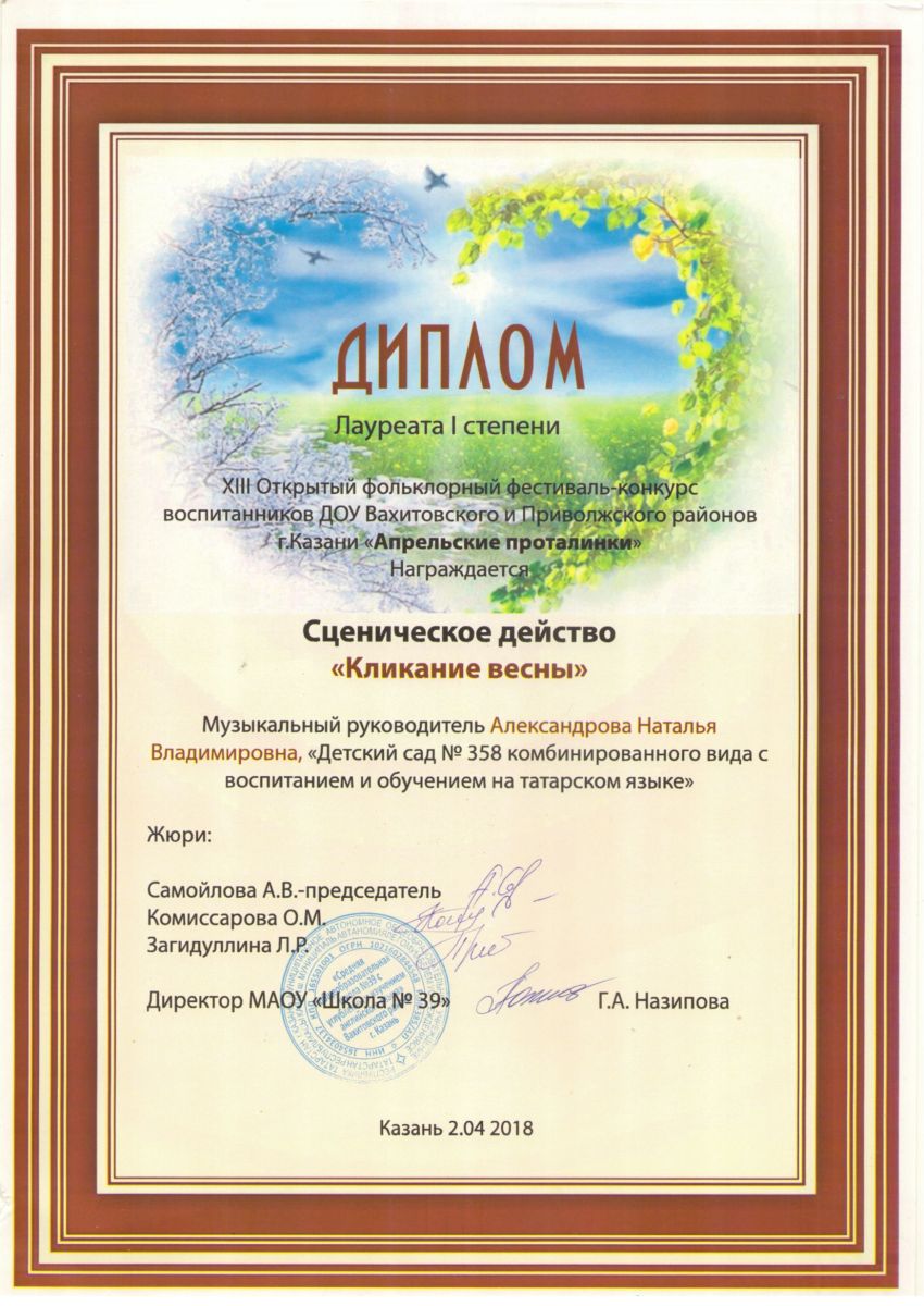 Безнең балалар бакчасында тәрбияләнүче балаларны һәм музыка җитәкчесе Александрова Наталья Владимировнаны Казан шәһәренең Вахитов һәм Идел буе районнары мәктәпкәчә белем бирү оешмаларының балалары арасында уздырылган X Ачык "Апрельские проталинки" фольклор-этнография фестивалендә I дәрәҗә Лауреатлары булулары белән котлыйбыз!!! Безнең балалар башкаруында "Яз чакыру" номерын (гореф-гадәт, йола номинациясе) жюри бик югары бәяләде!