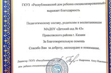 Благодарность от Республиканского дома ребенка специализированного г.Казани педагогам, сотрудникам,