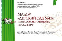 По итогам Республиканского театрального фестиваля-конкурс "Сайяр" награждается дипломант онлайн-фестиваля детских юношеских театров "Сәйяр-FEST" в номинации "Звезда сцены" МАДОУ "Детский сад №43" Приволжского района г.Казани РТ. Поздравляем наших победителей и желаем новых дальнейших успехов и побед!!!