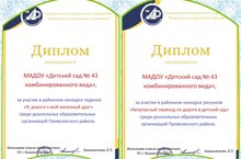 Коллективу МАДОУ "Детский сад №43" вручается диплом за участие в районном конкурсе рисунков Безопасный переход по дороге в детский сад" и поделков "Я, дорога и мой железный друг" среди дошкольных образовательных организаций Приволжского района. Молодцы!