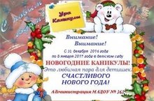 С 31 декабря 2016 года, по 8 января 2017 года в нашем садике новогодние каникулы. Ждем деток 9 января.