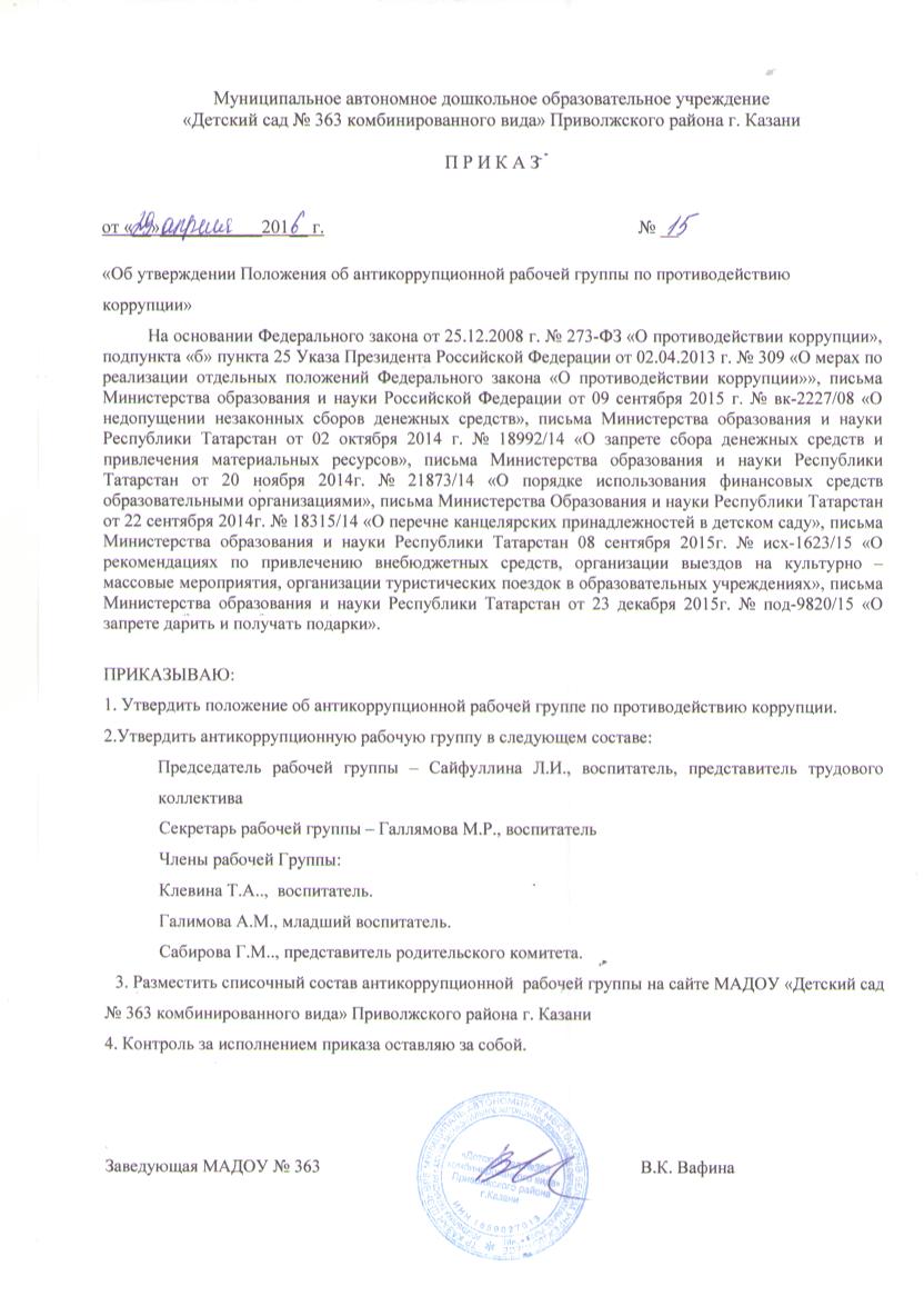 Приказ о создании комиссии по антикорупционной деятельности 2016 год