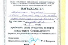 22 января в 139 гимназии состоялся районный этап городского конкурса "Звездный билет". Наша воспитанница Марчихина Лиза из 9 группы под руководством Антоновой Веры Владимировны достойно представили наш детский сад на конкурсе и заняли почетное 2 место! Поздравляем !!! Молодцы!!!
