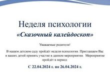 В нашем детском саду стартовала Неделя психологии "Сказочный калейдоскоп" с 22.04.2024 по 27.04.2024 года.