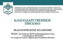 Поздравляем коллектив детского сада с получением Благодарственного письма за плодотворное сотрудничество, активную и эффективную работу по реализации инновационных проектов в области дошкольного образования от Института развития образования Республики Татарстан!Балалар бакчасы коллективын нәтиҗәле хезмәттәшлек, Татарстан Республикасы Мәгариф үсеше институтыннан мәктәпкәчә белем бирү өлкәсендә инновацион проектларны гамәлгә ашыру буенча актив һәм нәтиҗәле эш өчен Рәхмәт хаты алу белән котлыйбыз! -