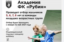 Академия Футбольного клуба "Рубин" проводит отбор мальчиков 5-8 лет в команды младших возрастных групп по футболу. Отбор будет проходить с января по май 2021 года. -