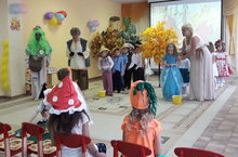 Радостной и веселой, многоликой чередой пронеслись осенние праздники в ДОУ. В каждой возрастной группе был свой мини-спектакль: со своими героями, песнями, танцами, стихами и, конечно, благодарными зрителями, нашими уважаемыми родителями. Ребята очень постарались, вели себя, как настоящие артисты. В младшей группе к ребятам пришли Матроскин и Шарик из Простоквашино и красавица Осень, ребята среднего возраста были рады Осени и красавице Сюмбели, в старшей группе вместе с ребятами встречали Осень Леший, Кикимора, Шурале. Ну, а подготовишки приготовили целое театрализованное представление про осень золотую.