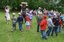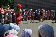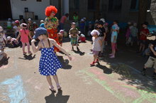 В гости к ребяткам пришел клоун - КЕША СОЛНЫШКИН, который с большим удовольствием соревновался в конкурсах, громко пел всеми любимую песню "Солнечный круг", принимал участие в показе мод, в конкурсе рисунков на асфальте "Пусть всегда будет солнце". Победители конкурсов были награждены подарками и громкими аплодисментами.