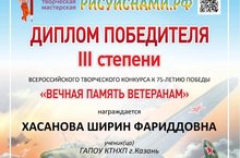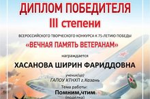 Студентка 2-го курса ГАПОУ "КТНХП" Хасанова Ширин заняла 3 место на Всероссийском творческом конкурсе 75-летия Победы с поделкой по теме: "Помним, чтим..." Поздравляем, желаем дальнейших успехов.