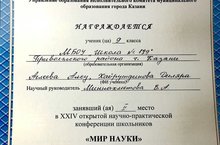 2 место в XXIV городской открытой НПК “Мир науки” у учащихся 9Л класса Аглеевой Алсу и Хайрутдиновой Диляры. Учитель химии Миннахметова В.А.