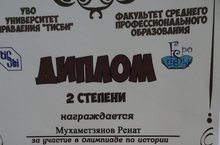 Поздравляем Мухаметзянова Рената, ученика 9 а класса за 2 место в олимпиаде по истории. Организаторы олимпиады ТИСБИ. Учитель Капитова Ч. Г.