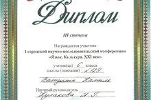 22 апреля 2016 года на базе гимназии №50 г. Казани состоялась I научно-исследовательская конференция «Язык. Культура. XXI век», в работе которой принял участие ученик 6 А класса Валиуллин Камиль. Его выступление по исследованию особенностей почерка учащихся основной школы «Первое правило вежливости» было признано одним из самых интересных и глубоких. Валиуллин К. удостоен Диплома III степени (учитель А.Г. Кулакова).