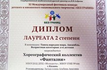 Поздравляем хореографический коллектив "Фантазия" - лауреатов II степени XI Международного фестиваля-конкурса детского и юношеского национального творчества "БЕЗ ГРАНИЦ" в номинациях "Танец народов мира" и "Народный танец". Конкурс проходил в г. Санкт-Петербург. Руководитель Загидуллина А.А.