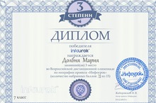 3 место во Всероссийской дистанционной олимпиаде по географии проекта "Инфоурок" у учащейся 7А класса Долбня Мария.